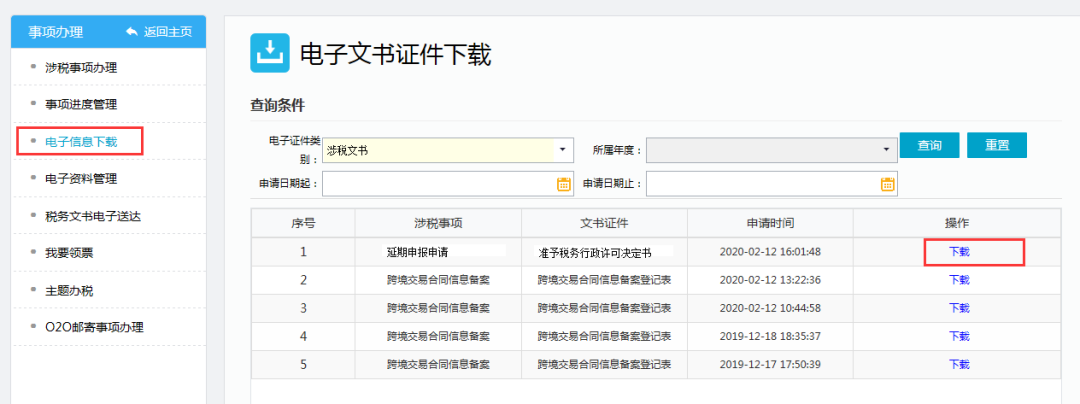 (5)可打印通知书。延期申报申请审核成功后,在我要办税—事项办理—电子信息下载中,可以下载打印相关文书。
