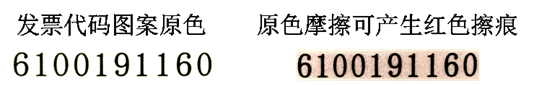 发票各联次左上方的发票代码使用防伪油墨印制,油墨印记在外力摩擦作用下可以发生颜色变化,产生红色擦痕(如下图所示)。