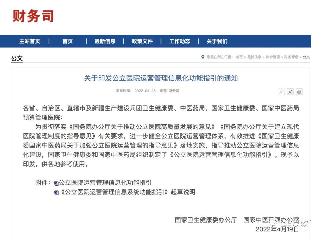2022年4月25日,国家卫生健康委和国家中医药局立足公立医院运营管理的内涵,聚焦医院运营管理要求,面向数字化时代的发展,组织制定《公立医院运营管理信息化功能指引》(以下简称《功能指引》),以引导各级各类公立医院运营管理信息化应用建设。