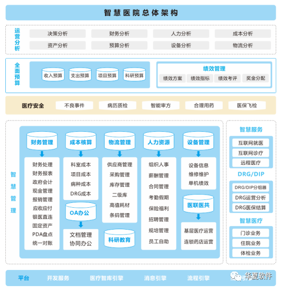 以会计核算为核心,合同管理及事务管理为抓手,全面预算为主线,人力资源管理、物流供应链、固定资产设备管理为基础,全成本核算、工分制绩效考核为杠杆的医院运营管理与决策体系。同时,结合人工智能、物联网、大数据、移动端等先进技术,结合质量监管、财务及资金监管、医院审计管理等监管体系,实现公立医院人、财、物、技互联互享、科学运作、全覆盖管理,全方位业财融合管理,盘活医院信息化资源资产,有效实现数据互通共享,实现高质量运营管理一体化建设。